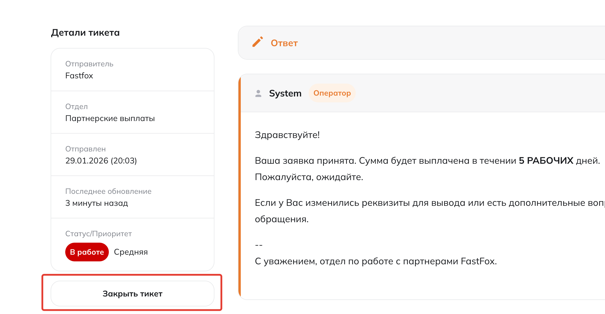 На странице «Выплаты» в блоке «Заявки на вывод средств» нажмите на «•••» у текущей выплаты, которую требуется отменить и далее нажмите Открыть обращение: